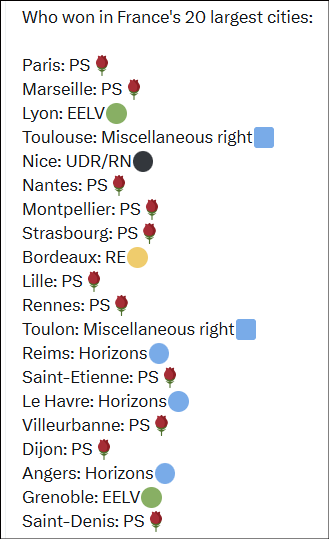 Socialdemokratiska PS som brutit sig loss från vänsteralliansens ledare Jean Luc Melenchon lyckades behålla borgmästarposten i Paris och vinna val i flera andra storstäder, utan att bilda några allianser med andra vänsterpartier.