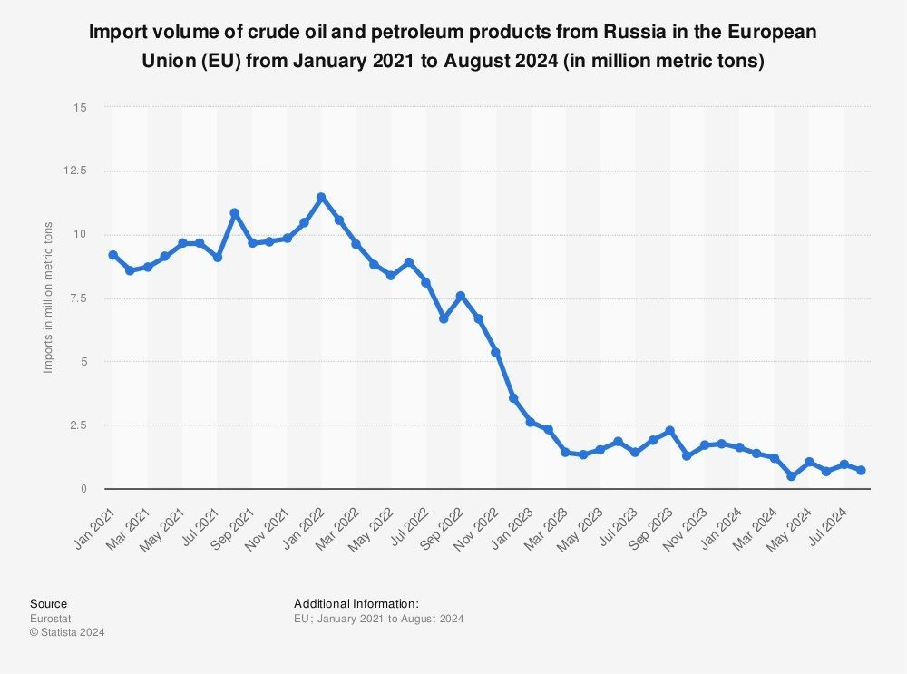 För oljan har EU minskat den ryska importandelen från 27 procent av oljan 2021 till 3 procent år 2024.